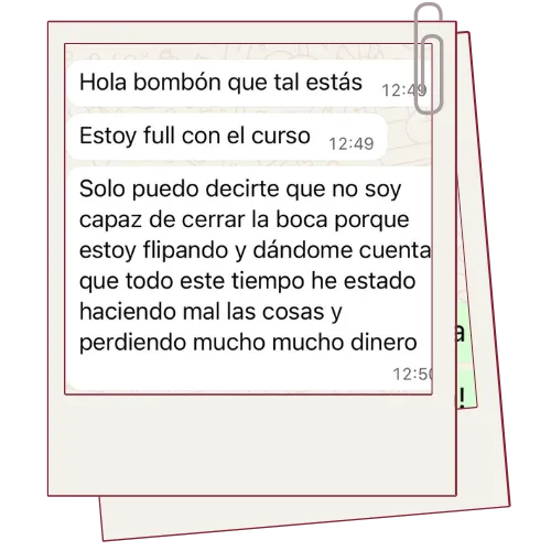 “Soy maquilladora y peluquera en el sector nupcial y he aprendido a captar más clientes sin vender y a mejorar todos mis procesos de gestión y comunicación con mis clientes, y a mejorar mi servicio a nivel interno. Lo que más me ha ayudado ha sido el soporte de tú a tú con Lidia para seguir perfeccionando”